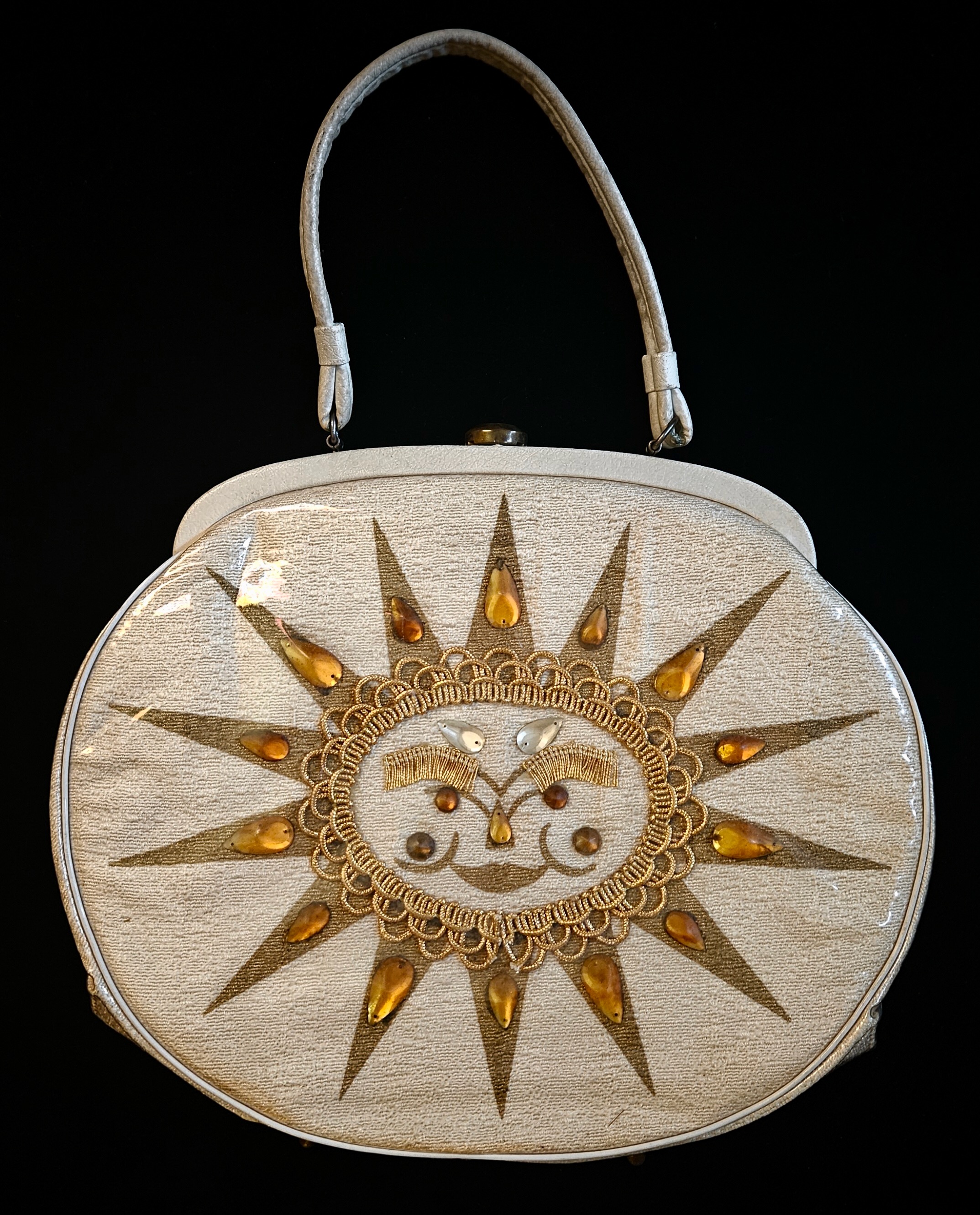Claire Fashions plastic-covered bag with sun motif. From the collection of The Vintage Purse Museum. |